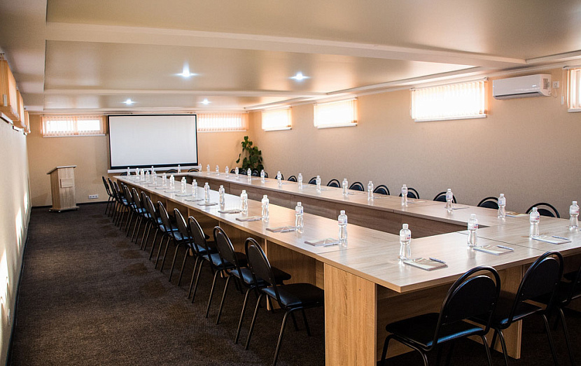 Для организации конференций, семинаров, тренингов и других мероприятий отель предлагает: большой конференц-зал на 150 персон, малый конференц-зал на 80 персон, комнату для переговоров до 12 персон, бизнес-центр (пользование ПК, распечатка, копирование, сканирование), Wi-Fi интернет по всей территории отеля, организацию корпоративных мероприятий, банкетов, свадеб, выставок, трансфер любым транспортом (автобус, минивен, легковой автомобиль).